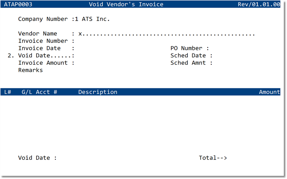 - Line Distribution — G/L Acct #, Description, Amount (supports multi-line splits).